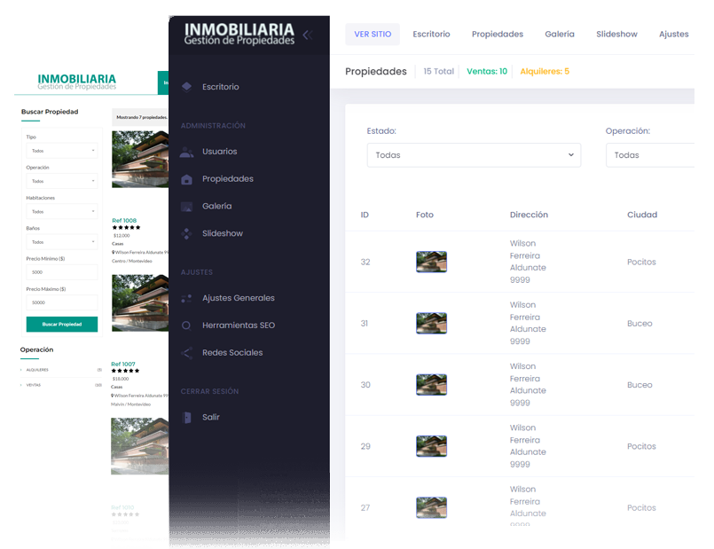 Plataforma con panel administrativo para inmobiliarias o gestores de propiedades donde vas a poder gestionar alquileres y ventas de terrenos, casas, apartamentos, oficinas y locales comerciales.